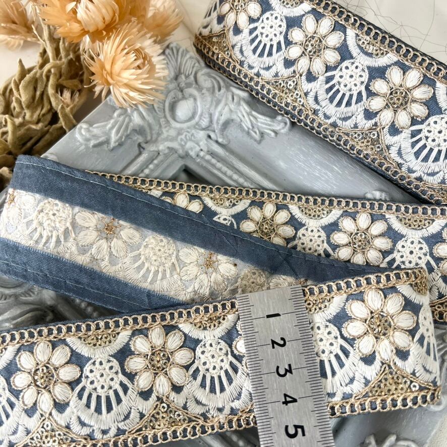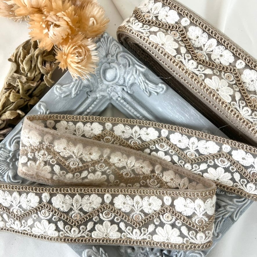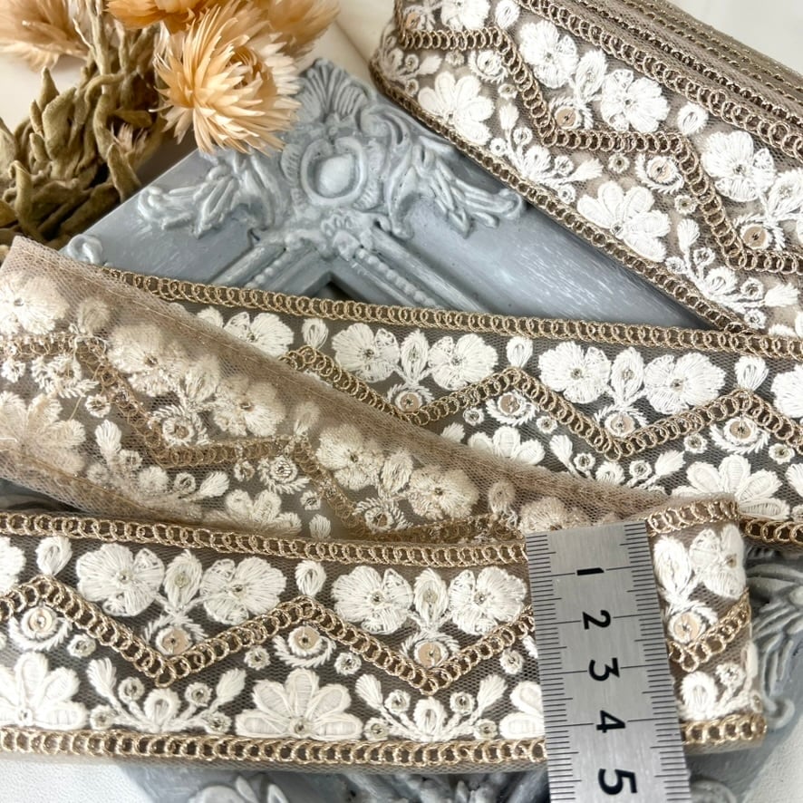 50cm インド刺繍リボン シルク/チュール 花柄 #pw94