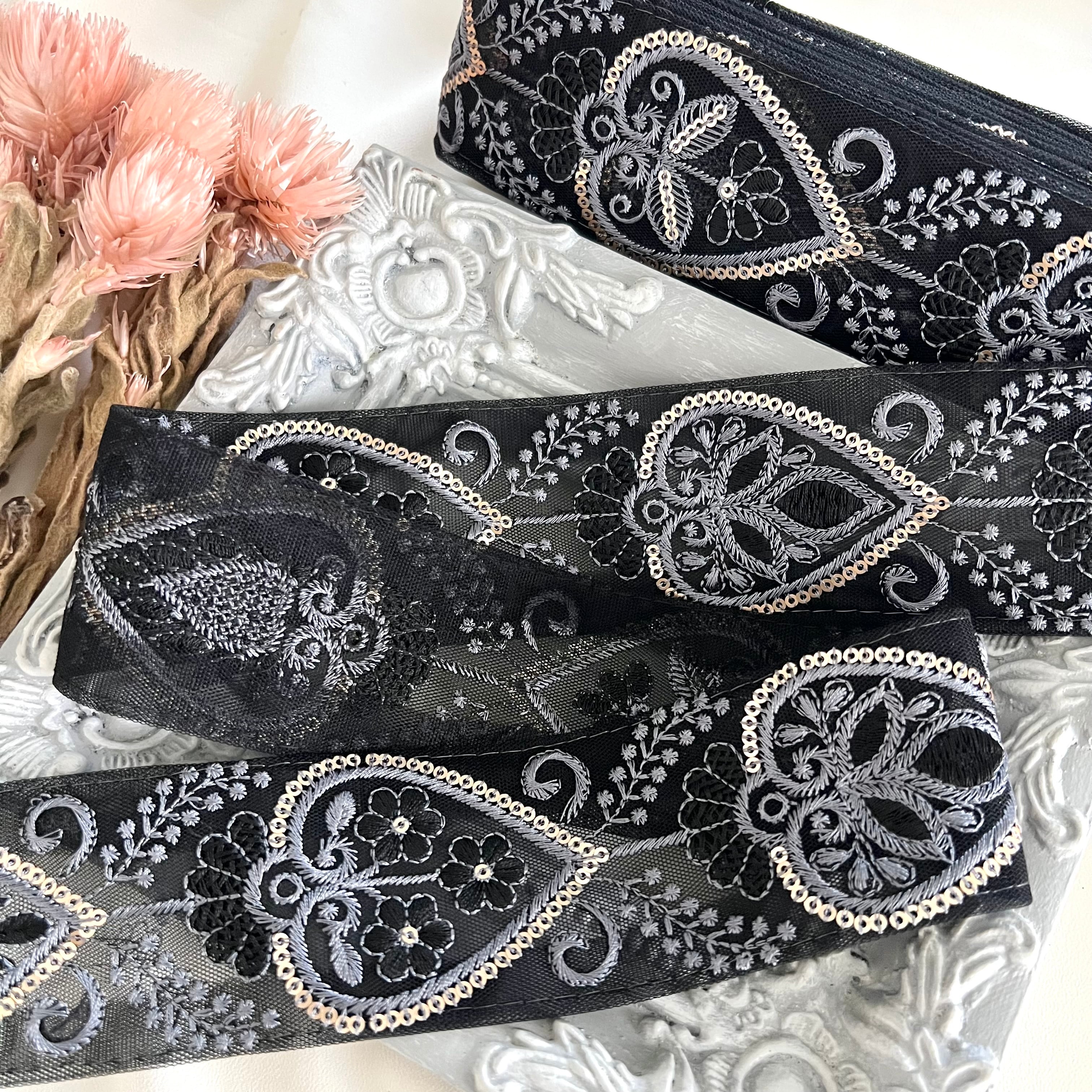 50cm インド刺繍リボン チュール 花柄 #mt71