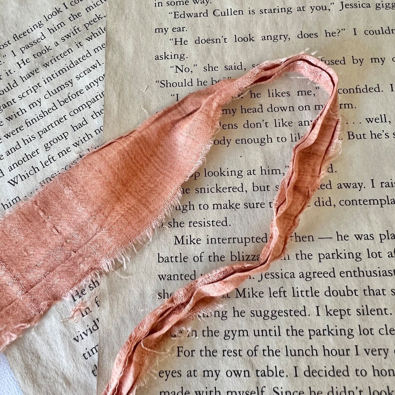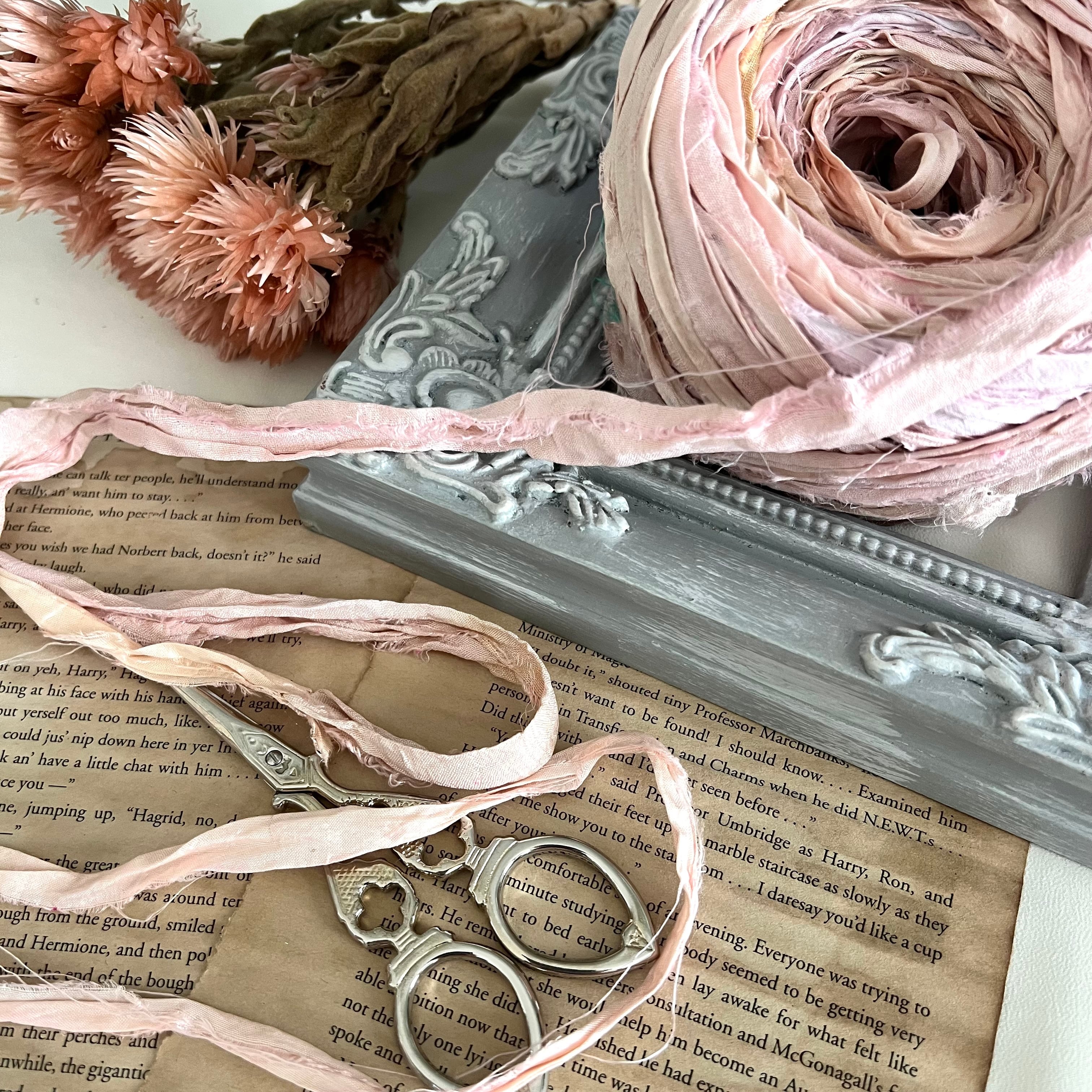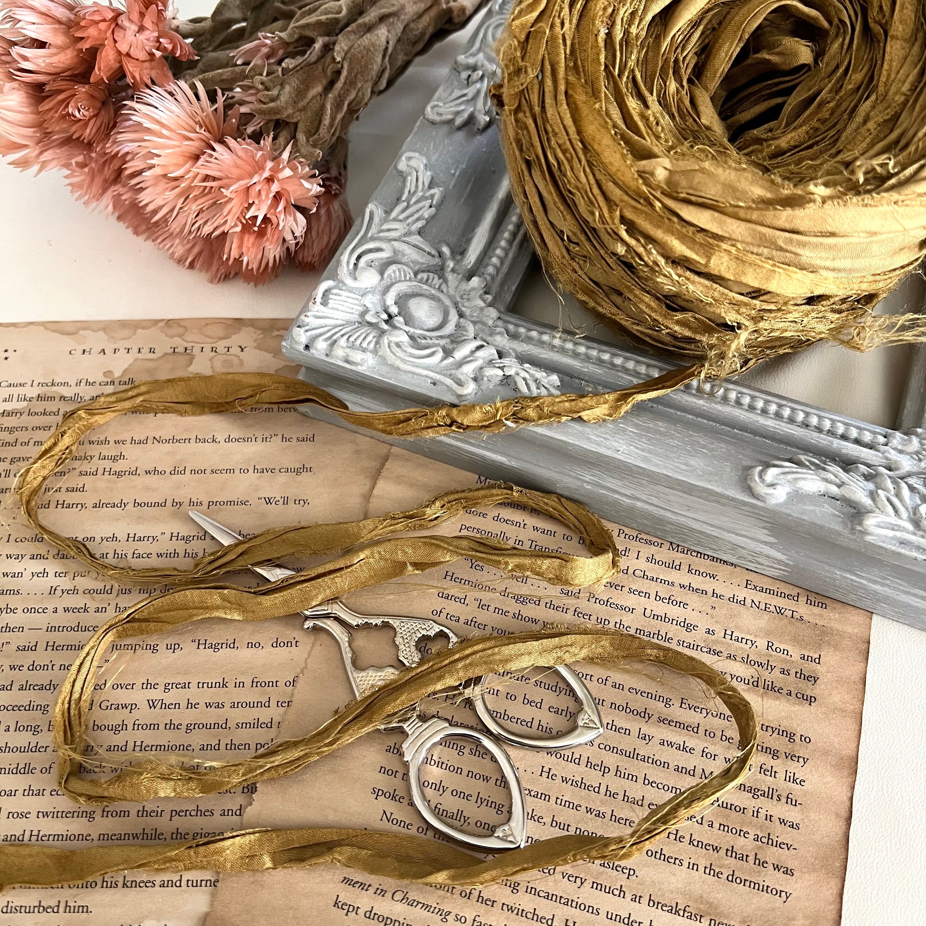 インドのサリー衣装で使われている生地の端切れを繋げてアップサイクルしたリボンです。
