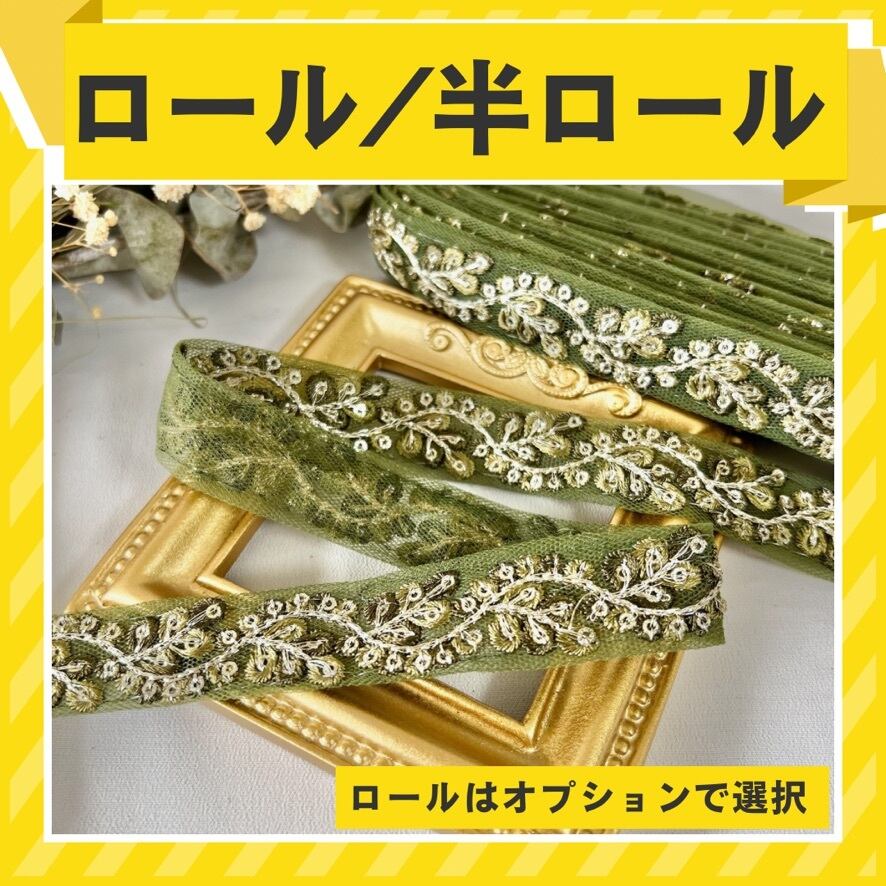 【半ロール/ロール販売】インド刺繍リボン チュール オリーブ 作家様応援価格 rnt1