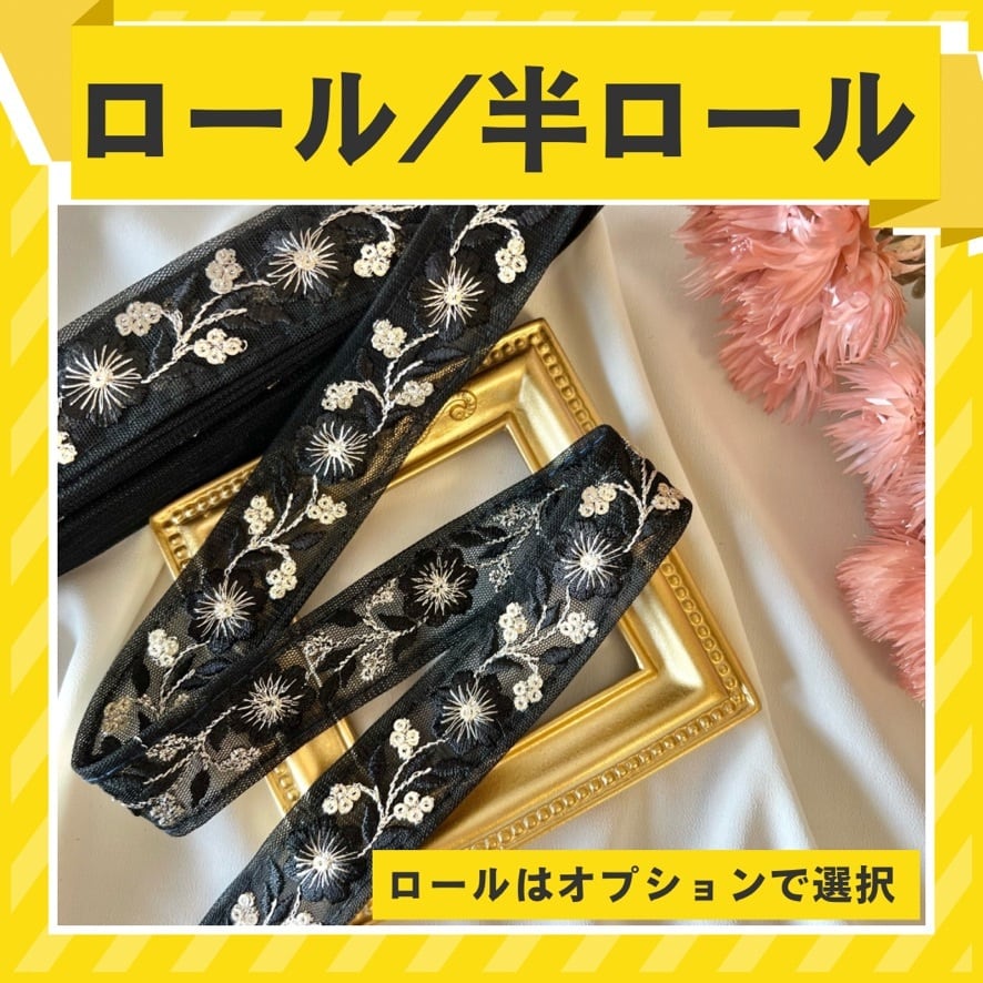 【半ロール/ロール販売】インド刺繍リボン チュール ブラック 作家様応援価格 rnt21