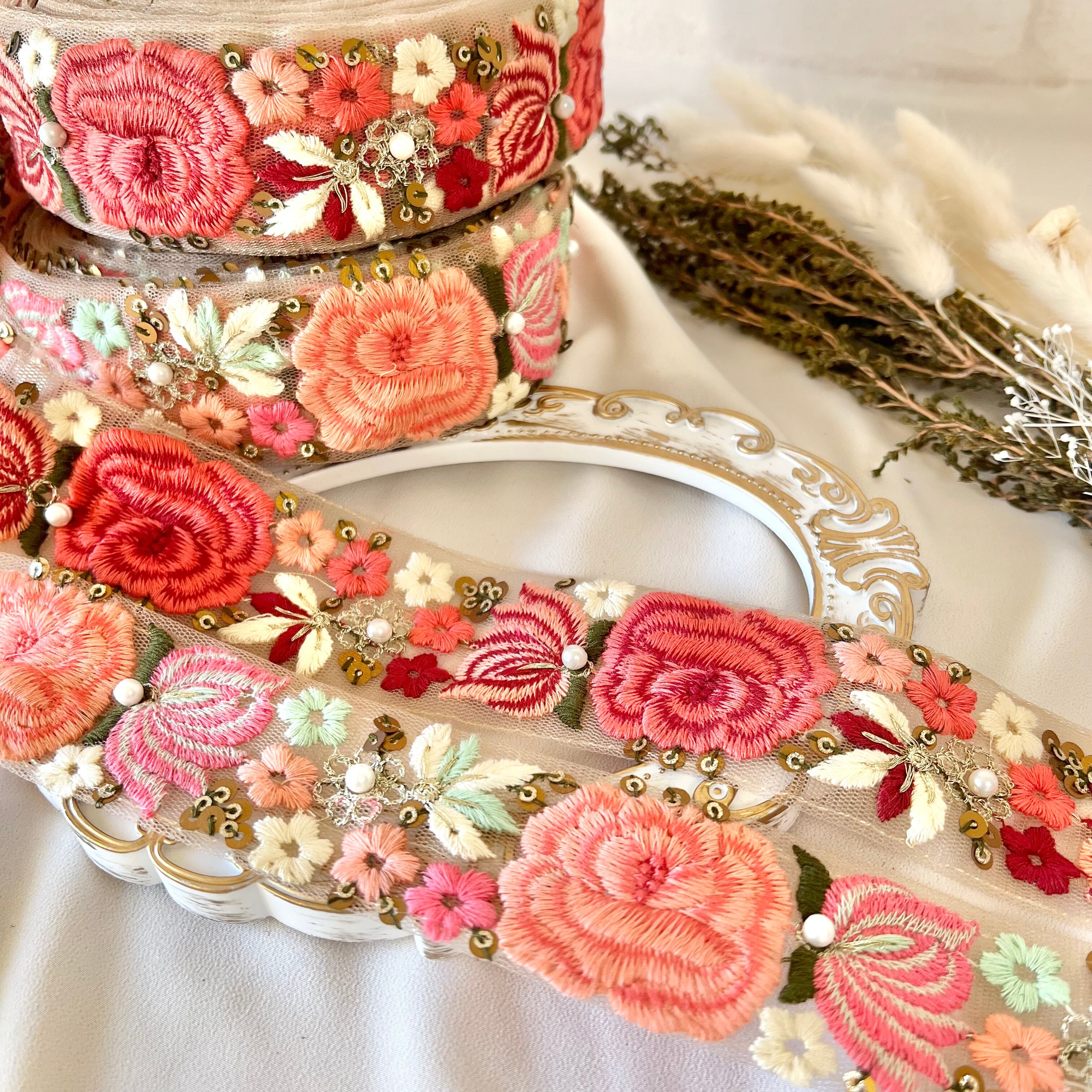 50cm インド刺繍リボン チュール パール付き花柄 #pw20