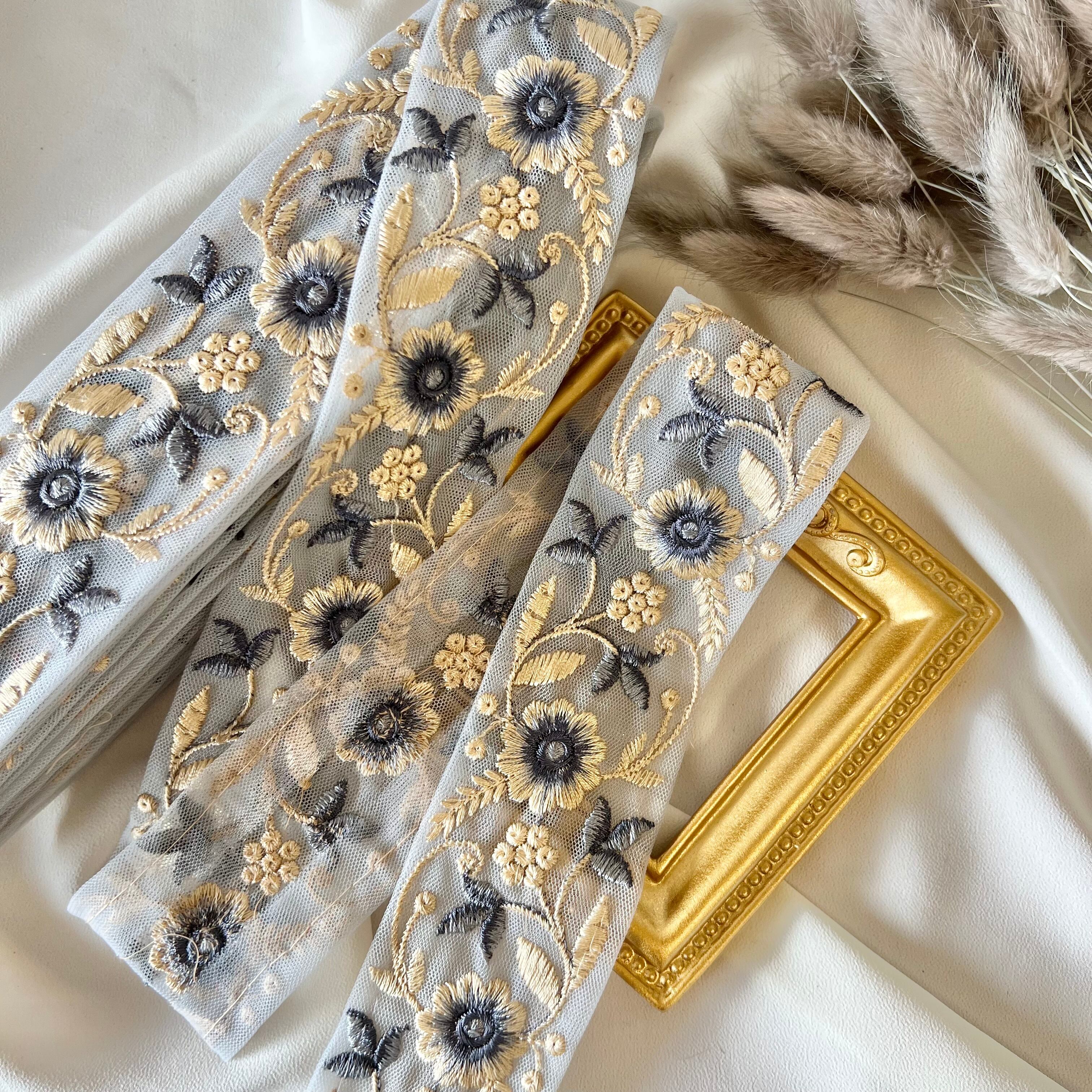 50cm インド刺繍リボン チュール 花柄 #mt42