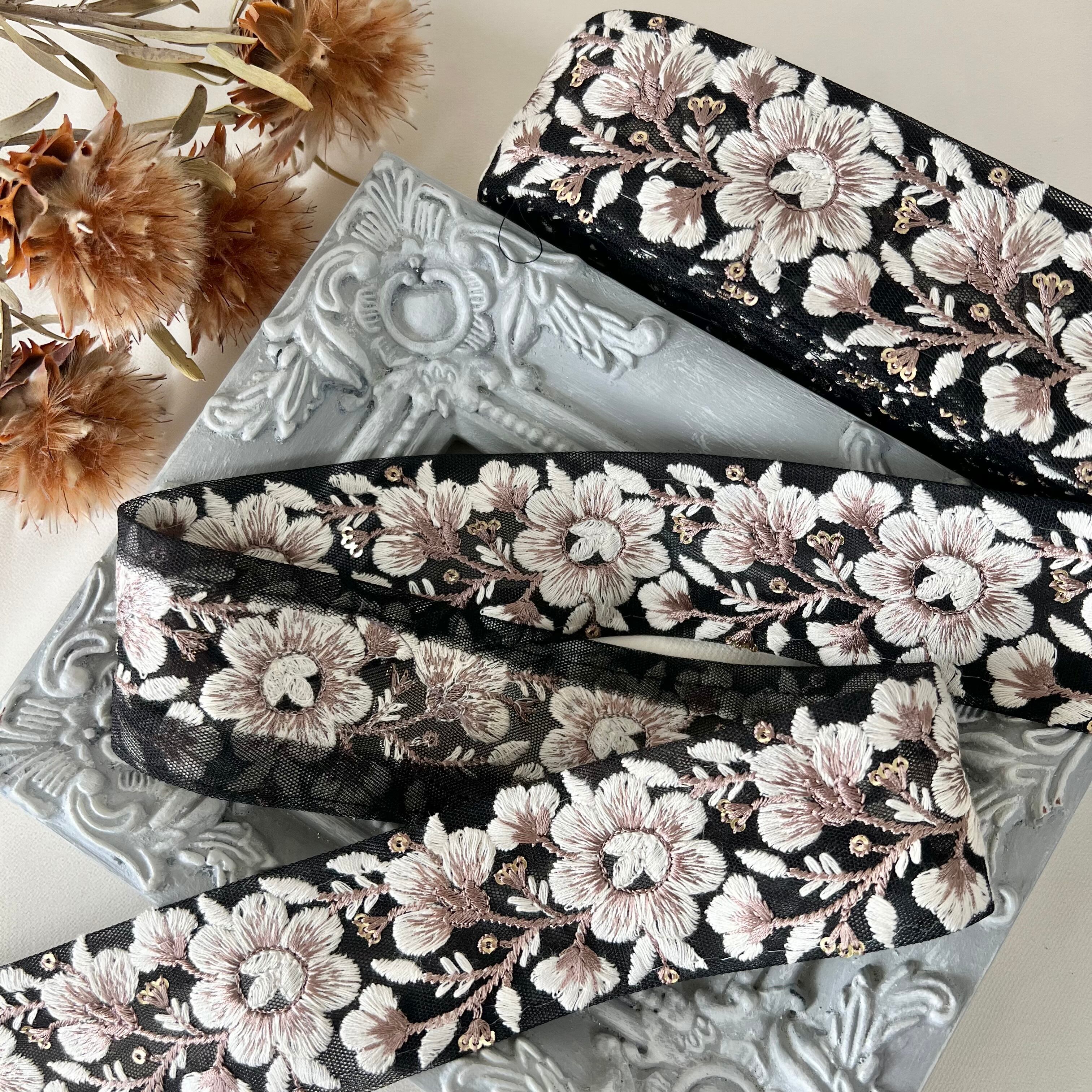 30cm インド刺繍リボン チュール 花柄 #mt58